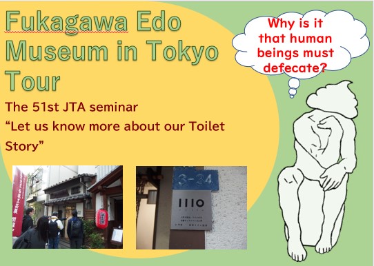 This time it was not an online event, but a real-life tour organized jointly with Toilet Culture Research Group. We toured Fukagawa Edo Museum in Tokyo and an adjacent Ward Public Toilet, guided by the tutor Mr. Eiki Morita, who is a historical toilet researcher. This Museum is an experiential facility that recreates the streets of the Edo period of 19th-century Tokyo in full-size, allowing visitors to get an experience for the past real life in Tokyo downtown area.